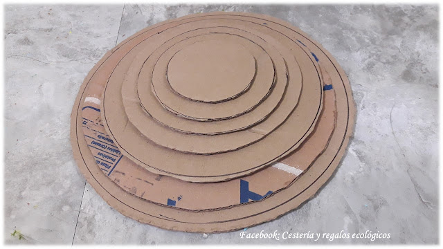 Básicamente los materiales son cartón grueso y tubos de cartón. Del cartón grueso cortaremos ruedas de diferente tamaño, de mayor a menor quitando en cada rueda siguiente 2 cms...