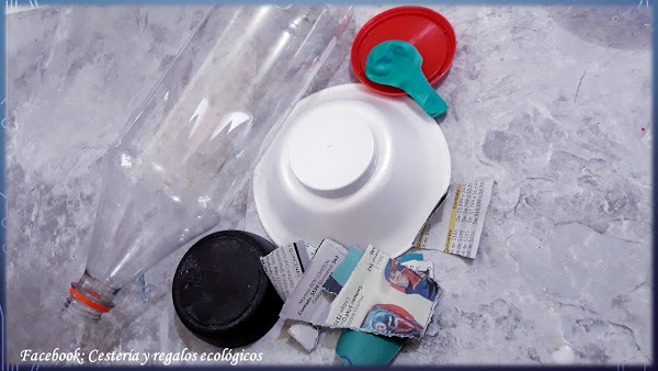 Y mira lo que necesitamos para hacerlos: un platito de unicel o tergopol un tanto hondo, tapas de plástico, un globo pequeño, una botella de plástico desechable y papel... como ves, materiales muy sencillos...