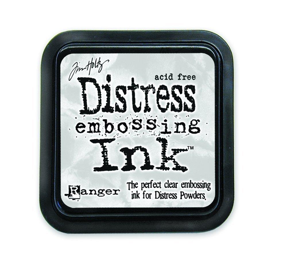 Debe de ser una tinta de secado lento y textura pegajosa para que se adhieran bien los polvos. Puede ser de color para poner polvos transparentes o tinta transparente para poner polvos de color. Yo, personalmente para empezar, escogería la transparente. Esta la Distress embossing ink de Ranger. Su precio habitual es de 4,99€ y aquí la puedes encontrar por 4,64€ gastos de envío gratis.