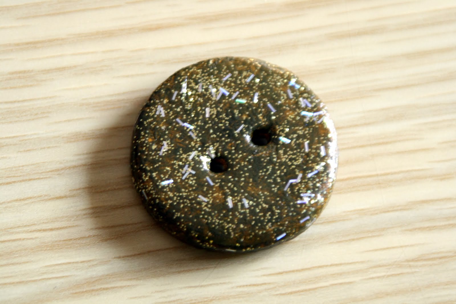 El acabado del botón lo conseguí con pintura acrílica marrón y finalmente una capa de esmalte de uñas con purpurina que tenía por ahí. Quizás en la foto no se aprecie demasiado bien, pero le da su toque de glamour ;-)