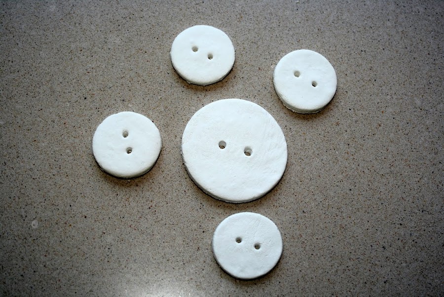 El siguiente paso fue buscar un elemento de cierre del bolso, ya que no iba a llevar cremallera. Estuve buscando un botón grande, pero como no tenía ninguno, decidí fabricarme uno yo sola a mi gusto. Con pasta de modelar (que ya había empleado en algunos de los collares que había realizado a crochet) y un par de cortapastas (de IKEA, por supuesto ;-) como no podía ser menos) me fabriqué unos cuantos botones.
