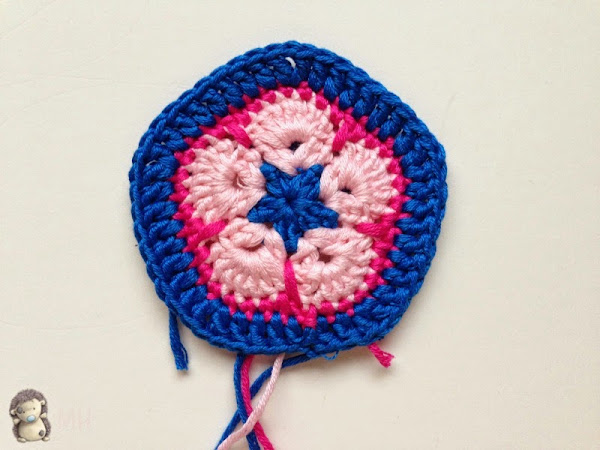 En la vuelta externa (la realizada en puntos altos de color azul) he hecho en cada pétalo 3pa, (1 pa, 1 cad, 1 pa), 3 pa, y posteriormente 1 pa en cada pae de la vuelta anterior (es decir, en los puntos entre los pétalos).