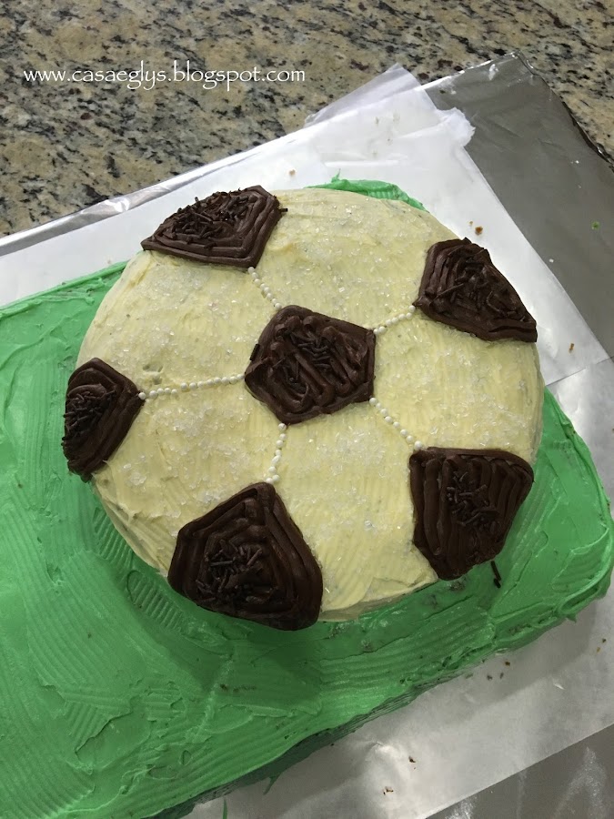 Esta vez queríamos un pastel de fútbol, así que con mi poco conocimiento sobre decoración de pasteles comencé a empatucar el pastel, jajaja!.