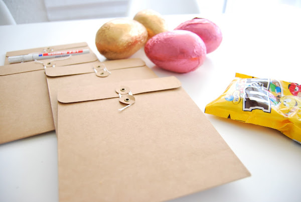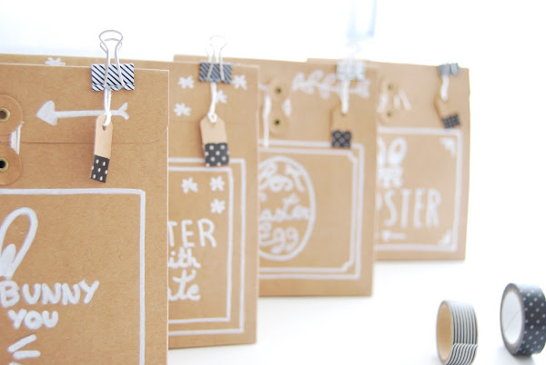 y como lo bueno de Pascua es que todo sirve para guardar chocolate, todo, si el año pasado usamos cajitas chinas de cartón, este años me han servido unos sobres con este cierre de cordón (estos son de Hema, pero creo que los tienen similares en Oh Naif) y la inestimable ayuda de mi mejor amigo de todos los tiempos, el rotulador de tiza, y mi otro mejor amigo Pinterest donde pude encontrar algunas ideas para las ilustraciones.