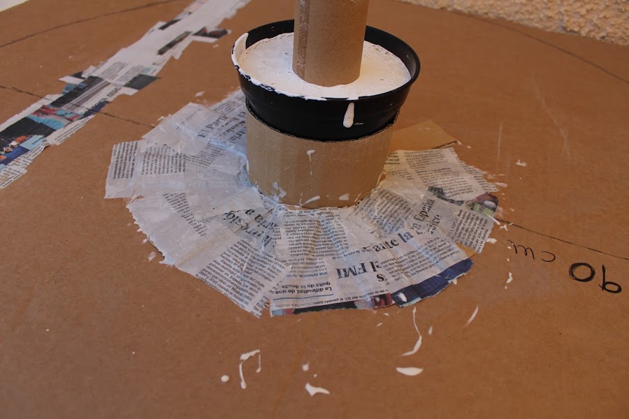 La base, o tronco, son unas cajas de papel de fotocopiadora. Quiero decir que están llenas y pesan, con esto tampoco queríamos arriesgar.