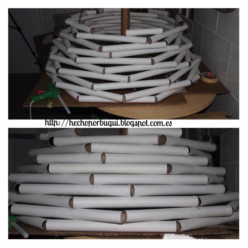 Había imaginado que poniendo los tubos pegados por las puntas en forma de V podría ir dando forma redonda ya que no quería que terminase pareciendo mas una pirámide que un árbol de navidad.