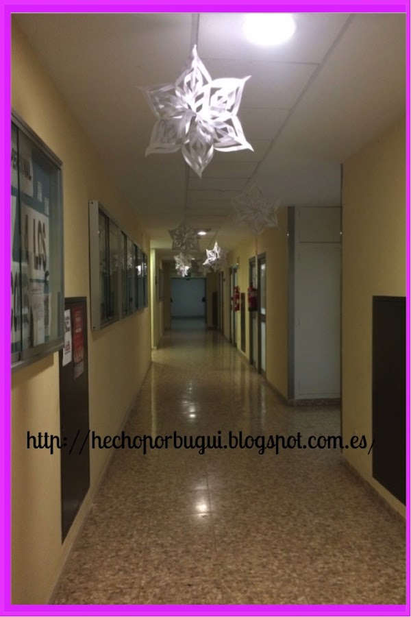 Con folios reciclados hicimos estos copos que han decorado todo el pasillo, también unos ángeles en las puertas. Que puedes ver en este post. AQUI