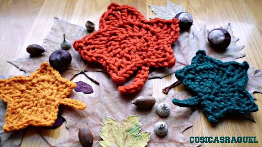 Hoy te enseño a hacer estas hojas de crochet que ví en un video de youtube, el patrón lo podeis encontrar en http://happyberrycrochet.blogspot.com.es/2014/08/how-to-crochet-maple-leaf.html pero como está en inglés pues lo pongo aquí traducido y explicado en español, es más fácil de lo que parece sobre todo si sigues el video porque ,aunque está en ingles puedes ver como va haciendo los puntos.