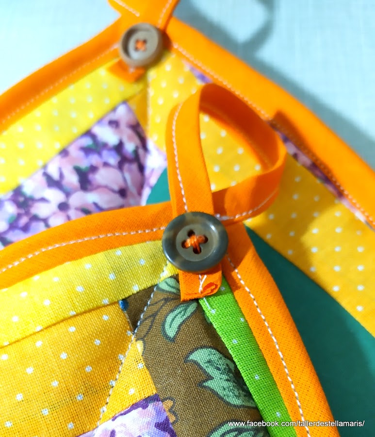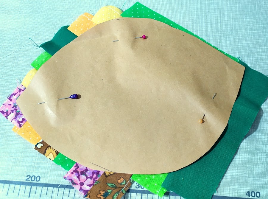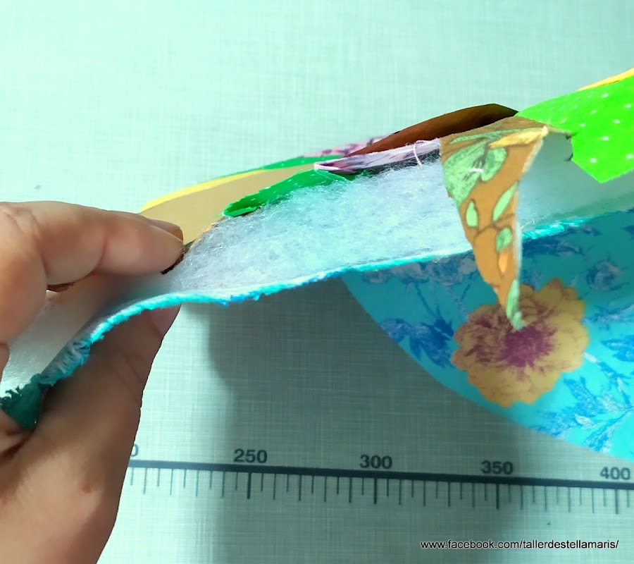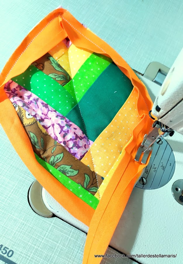 y comienzo a coser tiritas de colores de unos 4cm de ancho a cada lado...