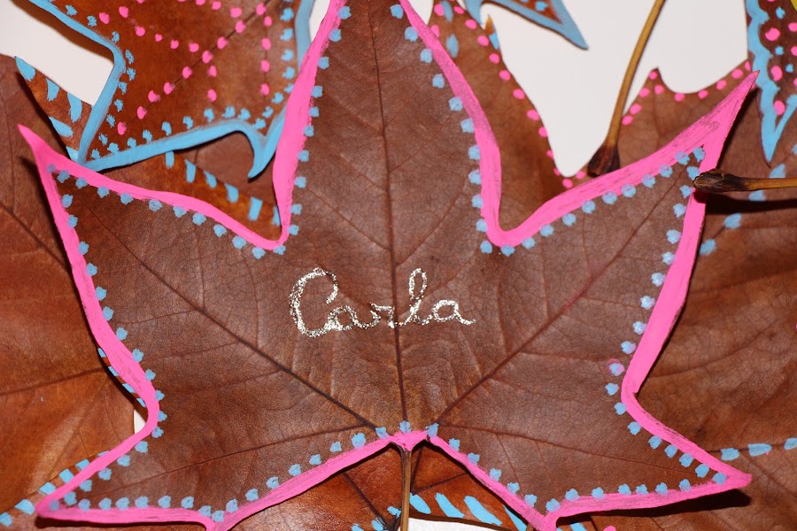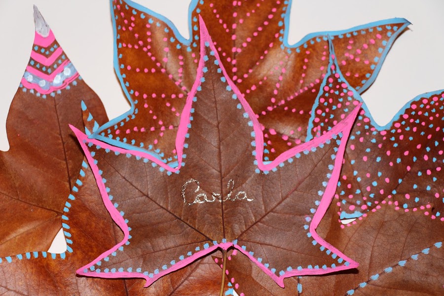 Con rosa y azul, decoré unas hojas más...otras menos..., con puntitos, rayas o motivos geométricos. Todas diferentes.