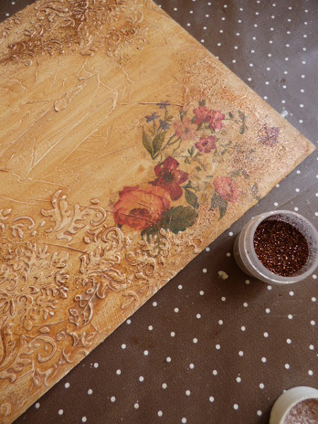Hace unos meses recibí un montón de cositas de manualidades, de parte de una amiga de mi madre, que después de años de ir a clases, quería deshacerse de todo su material de manualidades. Entre muchas cosas, habían unos botecitos de purpurina....la de este color marrón cobrizo me iba de maravilla para este trabajo.