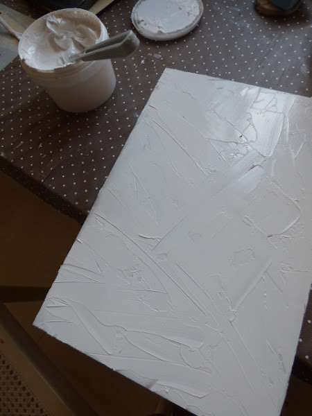 Para empezar extendí con la espátula,en todo el lienzo, una capa de pasta de relieve, sin mucho miramiento....en todas direcciones y la dejé secar
