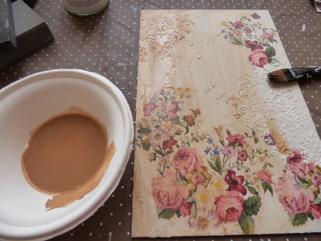Ya secos los relieves, con pintura muy diluida en agua, fuí dando capas del tono camuflaje de las pinturas de tiza de Artis Decor