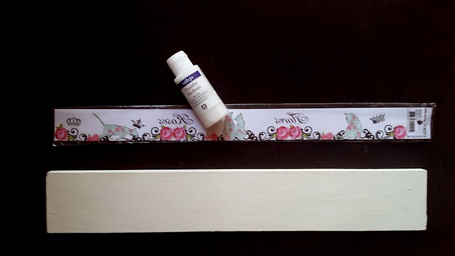 Lo primero, los materiales. Una imagen que compré en la feria DIY especial para transfer, con unos gatitos, flores y la palabra amor, que es la que nos ocupa, un retal de madera de los que van sobrando de otros trabajos - ya pintado con chalk paint blanca - y gel para transferencia de la marca Vallejo.
