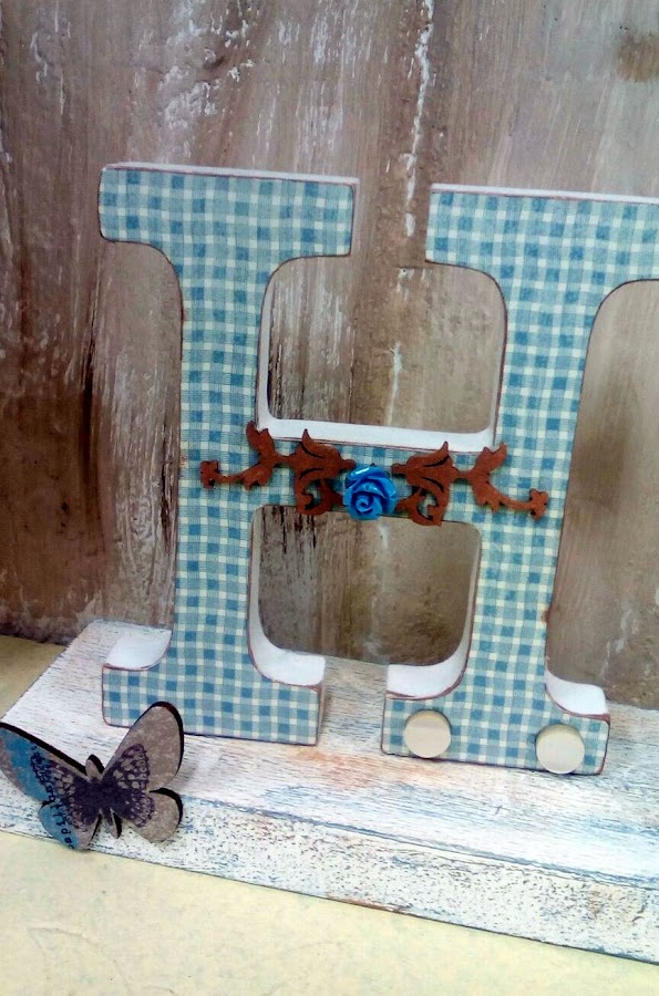 En la H una maderita con flor en el centro, un par de abalorios de nácar y debajo la mariposa de madera a tono con el conjunto.