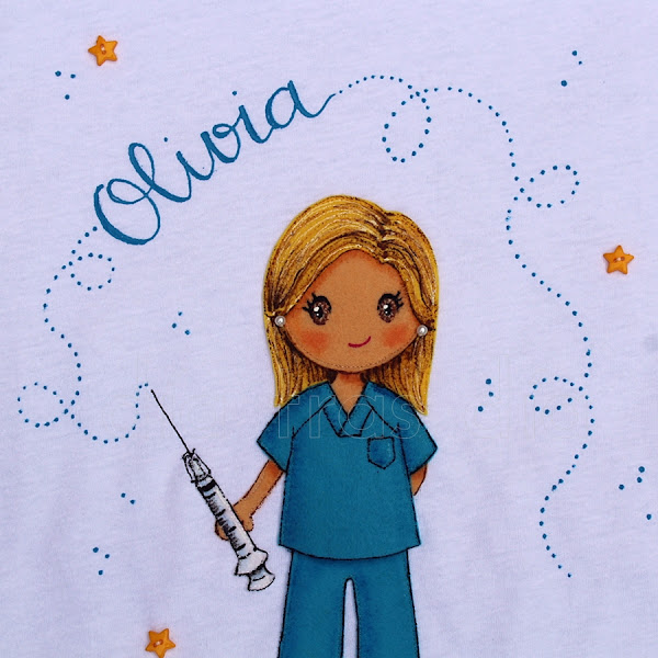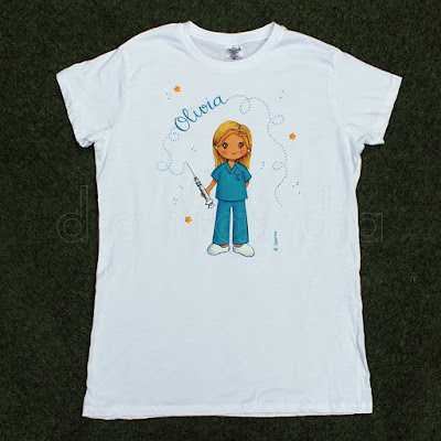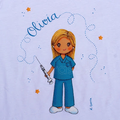 Pues como os decía, hace poco se puso en contacto conmigo Olivia porque había visto mis camisetas personalizadas y quería que le hiciera una para ella. Olivia es enfermera y quería tener una camiseta personalizada con una enfermera y con su nombre, para podérsela poner en sus guardias y estar cómoda.
