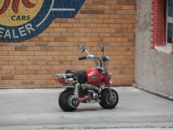 Otra motito Hotwheels, me gustaba el modelo, pero no estaba del todo bien logrado. Asi que la desarme por completo y lo modifique. Con clips y cables le construi la horquilla, luces y el porta equip ...