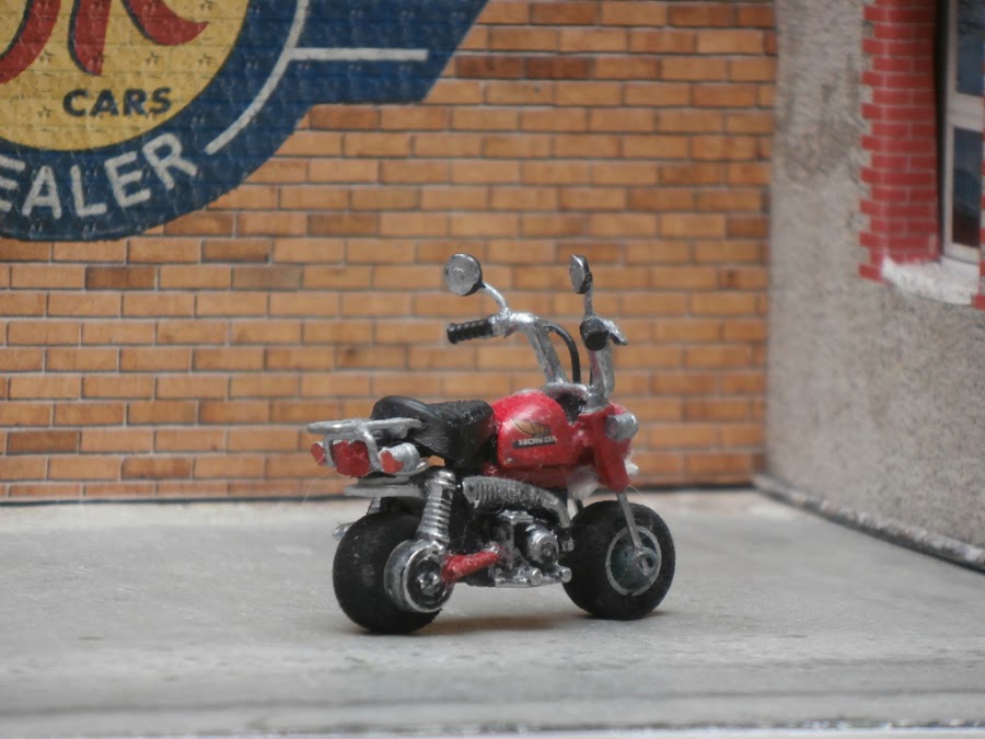 Con clips y cables le construi la horquilla, luces y el porta equipaje, tambien le reemplaze las ruedas por unas de slot.
