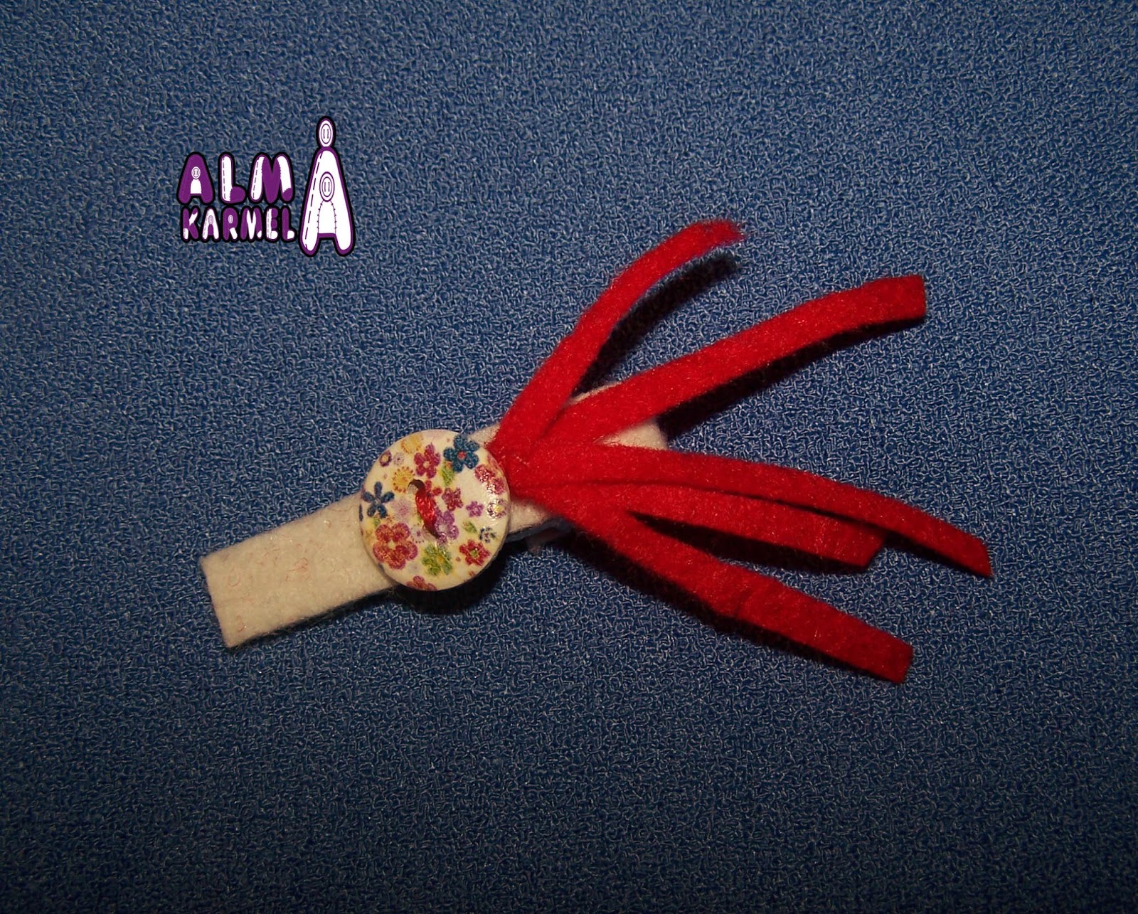 Y por último en esta ocasión, esta original horquilla forrada en blanco y rematada con un botón y unos flecos de color rojo.