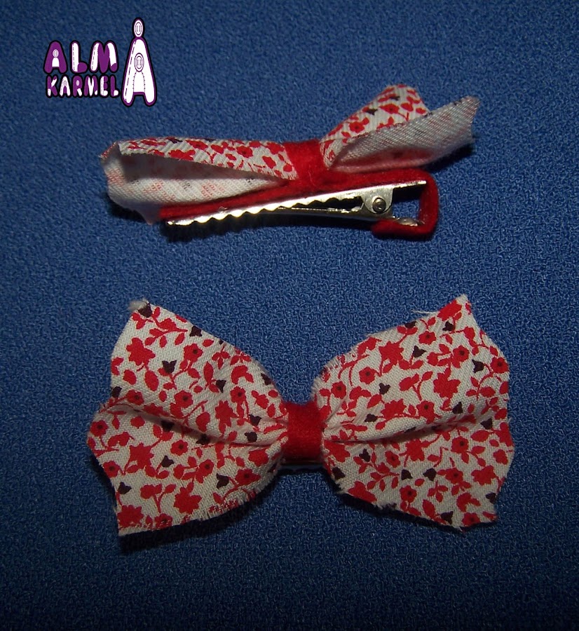 Ahora, en otro formato de horquilla, esta en tipo cocodrilo, os traigo estos bonitos lazos, realizados en tela estampada y horquilla también forrada en rojo.