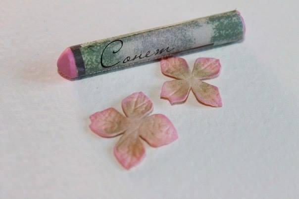Luego le damos la forma de las flores de 4 pétalos. Teñimos cada flor con la crayola oleo pastel.