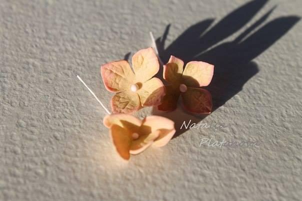 En el centro de cada flor metemos un estambre artificial y juntamos con el masking tape varias flores en una flor grande de hortensia.
