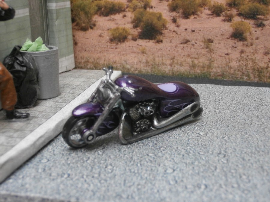 Otra motito Hotwheels, me gustaba el modelo, pero no estaba del todo bien logrado. Asi que la desarme por completo y lo modifique. Con clips y cables le construi la horquilla, luces y el porta equip ...