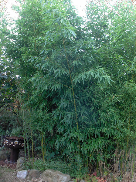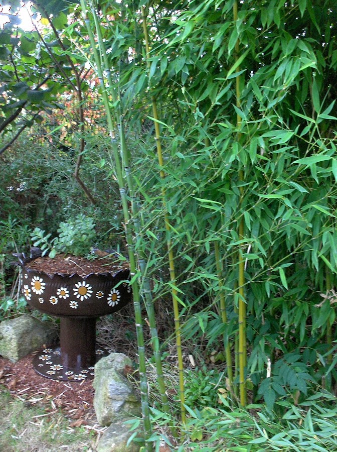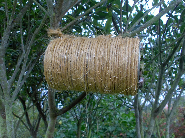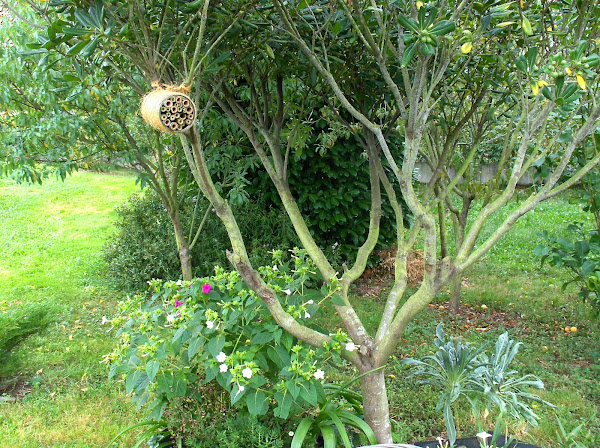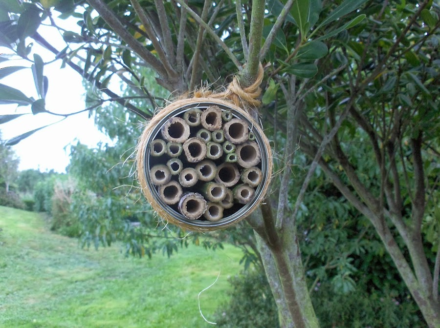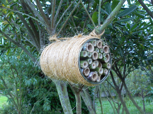 los bambús los tengo en un rincón del jardín, son pequeños aún, pero con sólo uno y un poco de un resto que tenía..... hice el hotelito, espero que les guste, si empiezan a taparse agujeros, es buena señal que habrá inquilinos, también quiero saber cuál es la medida de agujero que prefieren para hacer los siguientes lo más adecuados posibles.
