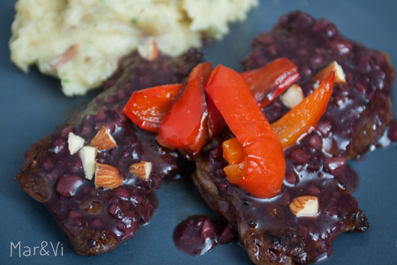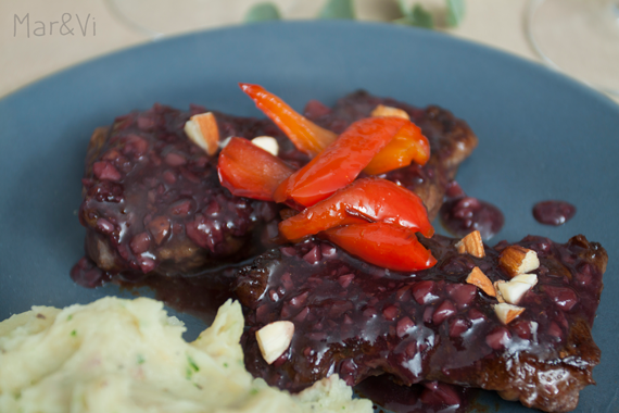 Emplatamos la carne, echamos la salsa y decoramos con las almendras que habíamos reservado. Encima colocamos unas cuantas tiras de pimiento caramelizado.