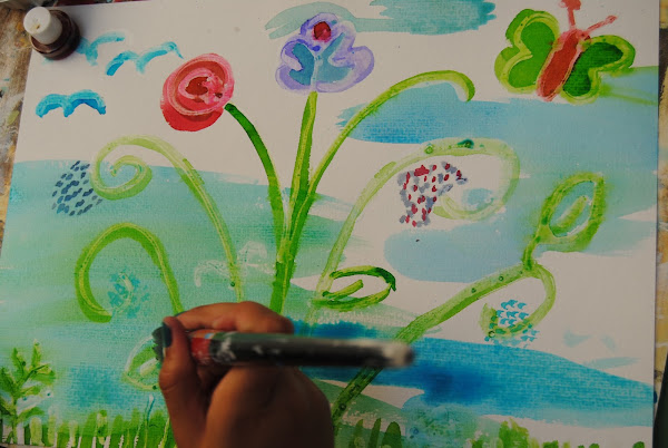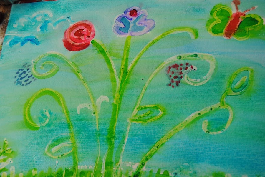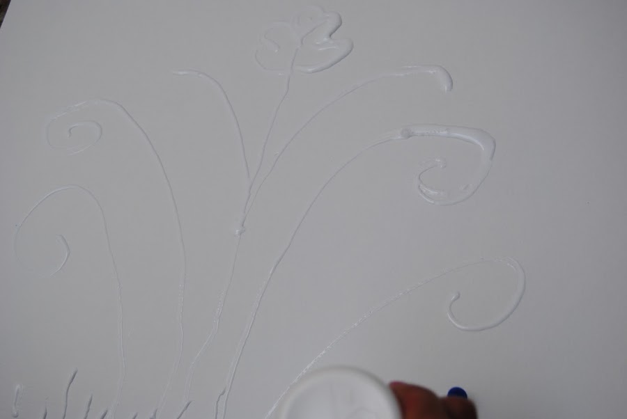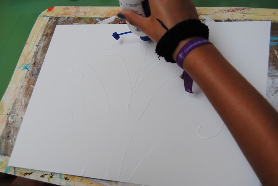 Inicialmente realizamos el dibujo con la cola, directamente aplicada sobre el papel de acuarela.