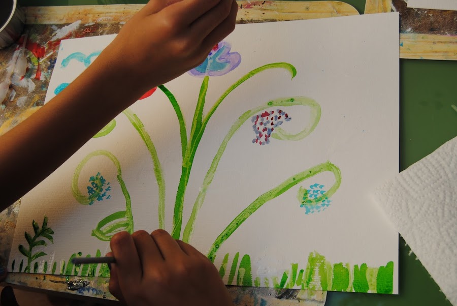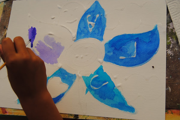 ¡y comenzamos a pintar! En las zonas donde hay cola, la pintura también se fija, pero deja un acabado ligeramente diferente. Hay que pensar que todos los colores que mezclemos en el papel de acuarela se mezclarán entre sí. Si no quieres que se mezclen, deberás dejarlos secar antes de continuar.