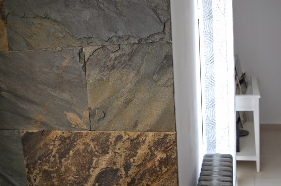 Yo sin ir mas lejos os muestro las de mi casa, es una reforma de una vivienda existente y me encanta mezclar paredes lisas con pizarra o laja, así que aqui os la muestro: