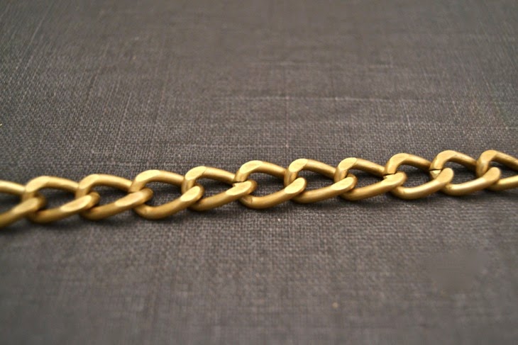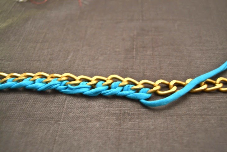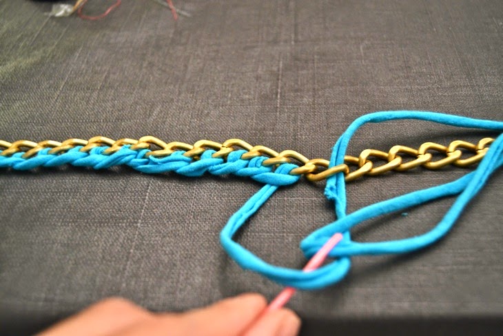 Primero tenemos que ir pasando una tira de trapillo por cada una de los eslabones haciendo un nudo en cada eslabón.