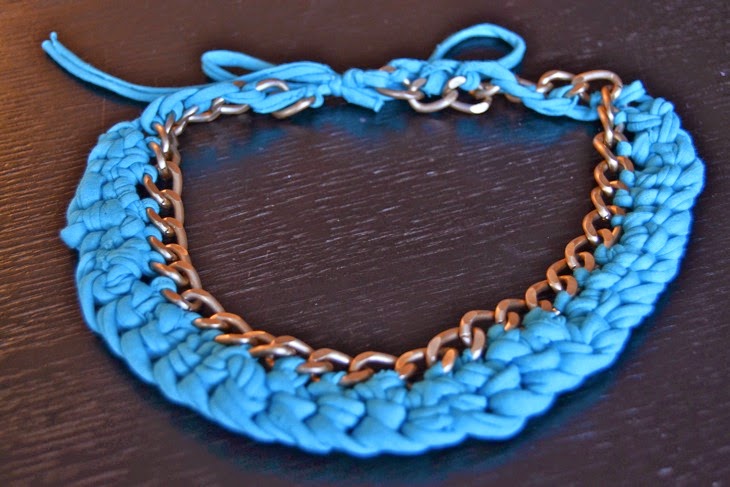 Y por último el collar de trapillo turquesa, en el que he usado, además del trapillo de color azul turquesa, una cadena dorada de mayor grosor, plana. A mi el collar turquesa es el que más me gusta.