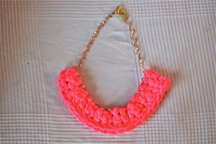 En el collar de trapillo rosa fluor he usado además del trapillo, una cadena dorada comprada en un chino y creo que el dorado le da un toque guay...