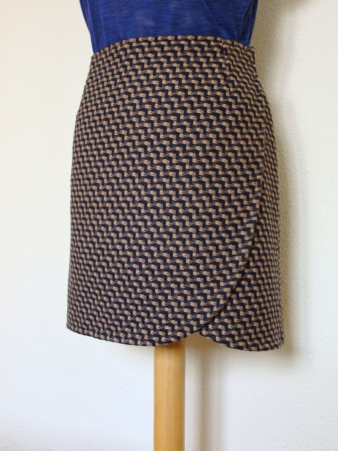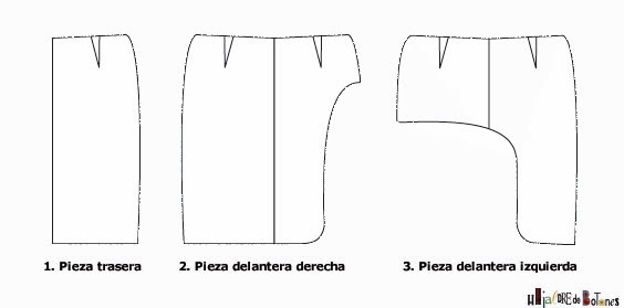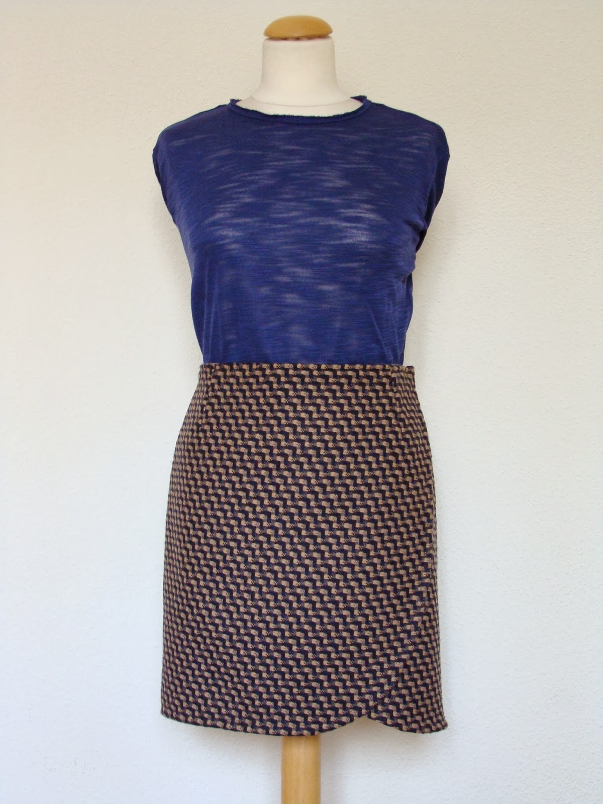 El diseño de la falda está basado en este patrón, una falda recta de talle alto y con abertura delantera que se obtiene al sobreponer los delanteros que se incorporan en las costuras laterales.