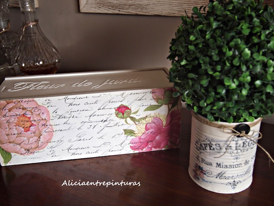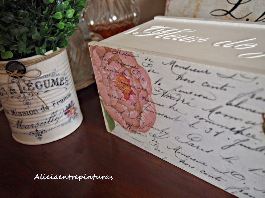 Aquí está mi aportación para darle la bienvenida. Una caja de vino, que en realidad es la caja de los hilos que utilizaba mi madre y que yo también utilizo ahora. Lleva muuucho tiempo en casa, y hasta ahora no se me había ocurrido decorarla.