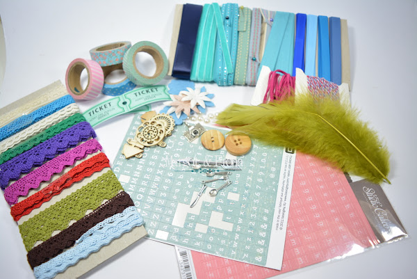 Florecillas, cintas y lazos, puntillas, figuritas de metal, figuritas de madera, perlitas, plumas ( yo uso mucho las plumas), pegatinas y troquelados, whasi tape, y algún que otro alfabeto, ...