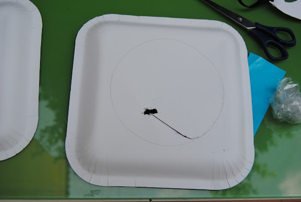 Lo primero que haremos es dibujar un círculo en la parte trasera del plato de cartón, que tendremos que recortar.