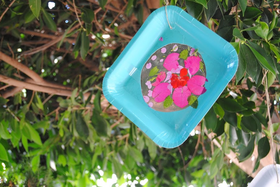 Platos de cartón, forro de libros (puedes aprovechar restos del año pasado), pétalos de flores y hojas de plantas.