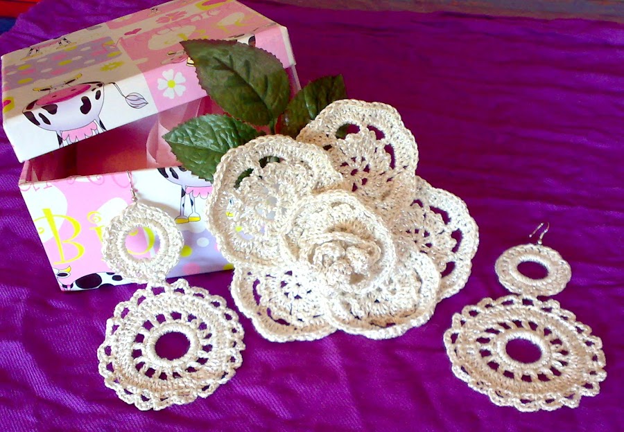 En fin, que ya no sigo, que mi coplilla inventá se torna verde como el trigo verde y luego me riñen jajaja. Preciosa , divina, original, y en beige con hilico plata, la flor y los pendientazos, que me ha regalado mi amiga Mariló, de Bailén, incluso me la ha colocado en una cajita de vacas y envuelta en papel de seda, detallista al máximo. Le ha costado un trabajo enorme ésta labor, pues no tenía gráfico, pero sí unas manos laboriosas que valen millones, y las cuales yo valoro aún más, pues el ganchillo no hay manera de que yo lo pase de la cadeneta, e incluso eso me sale feo, la verdad. Es lo único que se me resiste en ésta vida ( bueno, eso y Bratt Pitt), y mira que me han intentado enseñar y lo pruebo una y otra vez.