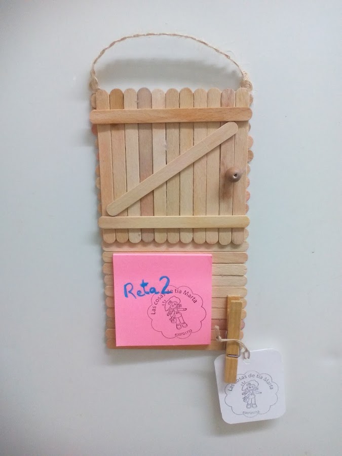 8. Con ayuda de una pinza, abalorios, post-it y cuerda decoramos la puerta.