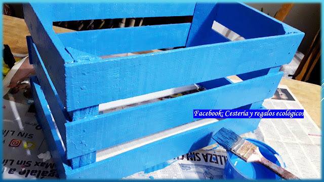 Pintamos. Podemos usar la pintura que tengas a mano, puede ser con base de aceite, o acrílica o vinílica (la que aplicamos a las paredes). Yo primero puse una capa de pintura blanca y luego una de azul, de esta manera el azul queda mas vivo el color...