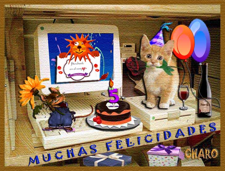Hola amig@s, muchísimas gracias por acompañarme en este maravilloso día, en el que mi blog cumple cinco años. Me parece mentira que contra viento y marea , aún siga por aquí, pero apesar de las dificultades que muchas veces me han hecho pensar en tirar la toalla, vosotros con vuestros cariñosos comentarios, vuestra ayuda siempre que os la he pedido y con el montón de amigas que tengo gracias a este bonito mundo blogueril, han hecho que hoy estemos de celebración.Es muy bonito ver que aún conservo algunas de las compis de hace 5 años, y ver como mi blog ha ido creciendo con nuevas amistades.Una de estas amigas de mis comienzos, ha querído festejar mi cumple blog, es increíble ver que a pesar de no conocernos personalmente, ella para mí es una persona muy especial, la llevo siempre en mis oraciones.Charo , ella hace poesía y unas composiciones maravillosas, es una persona muy informada y le gusta recordarnos siempre, esos día especialmente señalados. Este ha sido su maravilloso regalo: