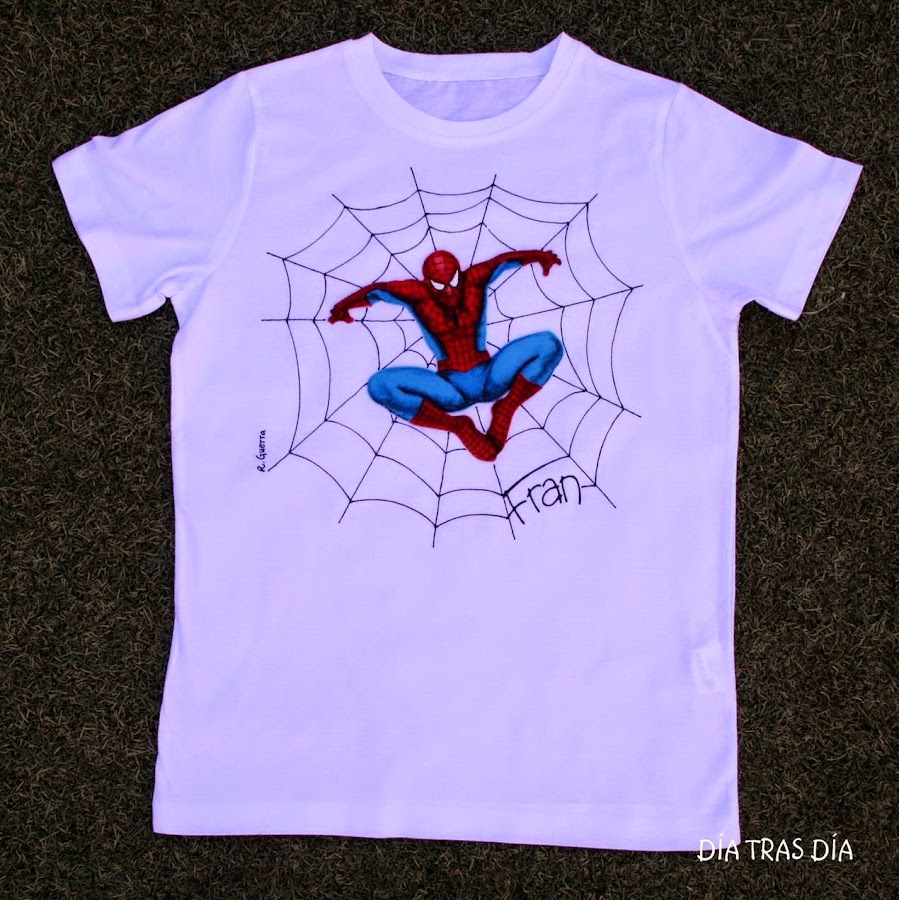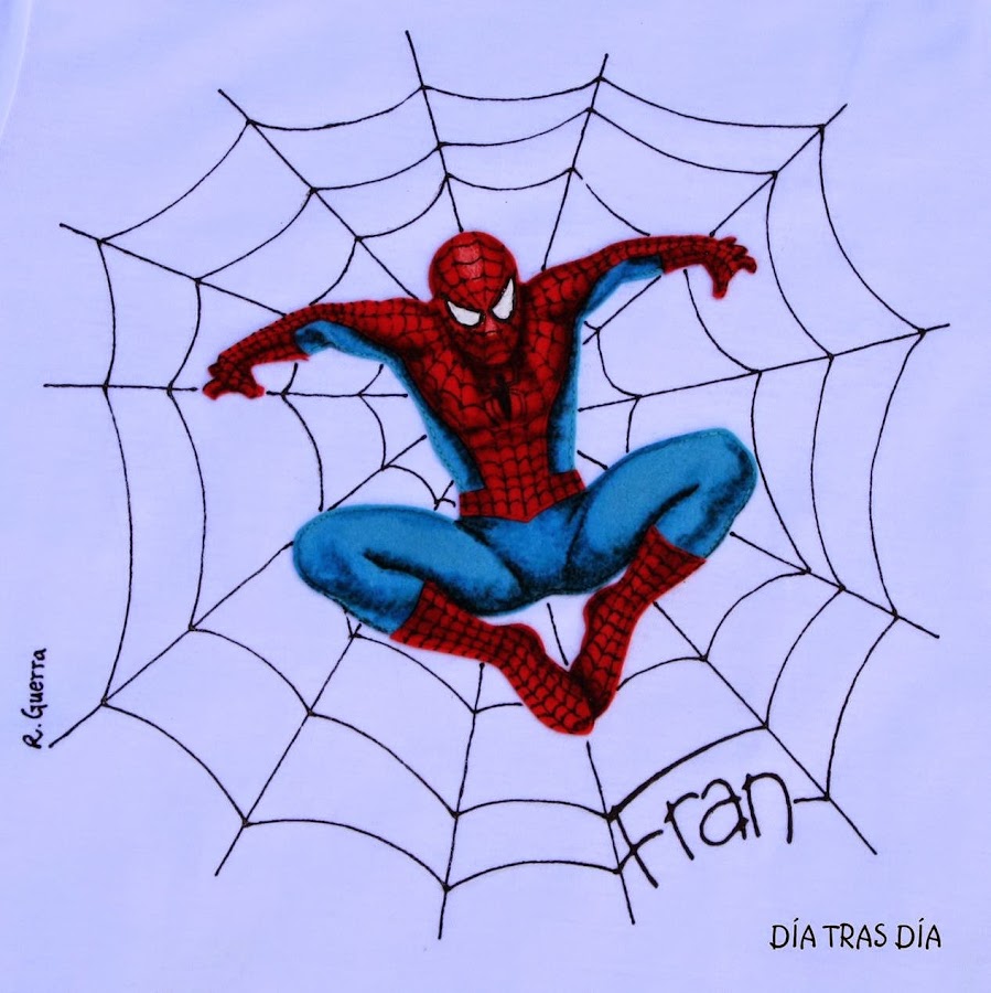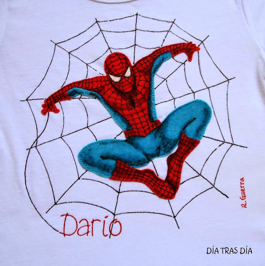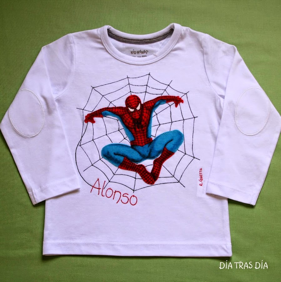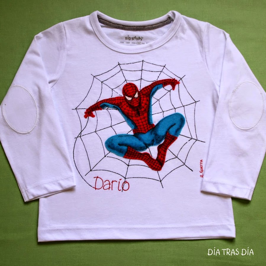 Y hace unos días, mi hijo Abel recibió una invitación de cumpleaños, de su amigo Fran. Y como no tenía muy claro qué hacerle, al ver que la invitación llevaba un dibujo de Spiderman, decidí hacerle una camiseta en el mismo estilo que las de Alonso y Darío, aunque esta vez en manga corta, que por estas tierras siempre es más aprovechable este tipo de manga.