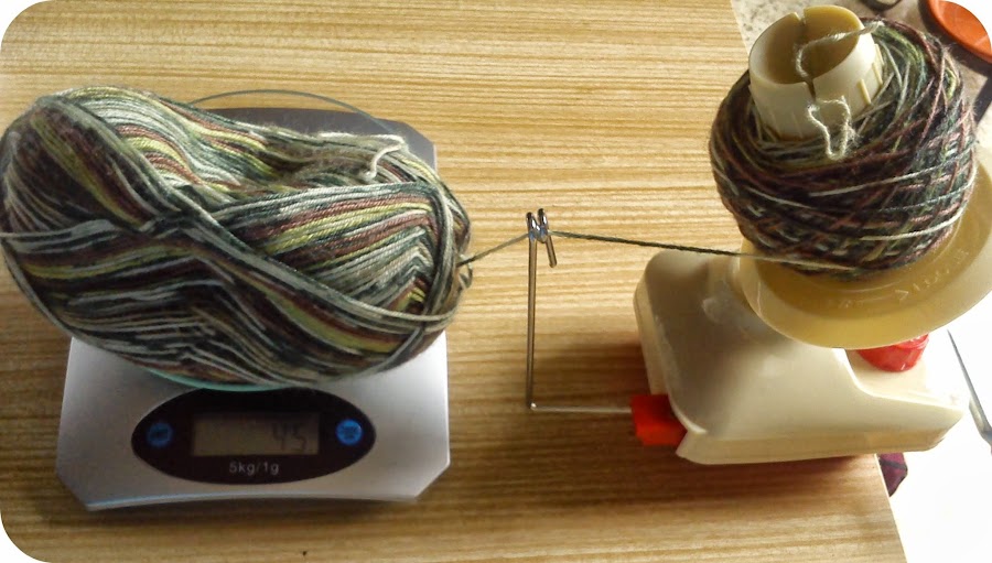 La siguiente tarea es repartir en dos madejas la lana para confirmar que cada calcetín tendrá sus metros correspondientes. Así sé que tengo una madeja por calcetín y cuando se acabe se acabó....me aseguro de que no robo metros pertenecientes al otro calcetín.