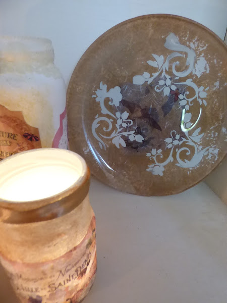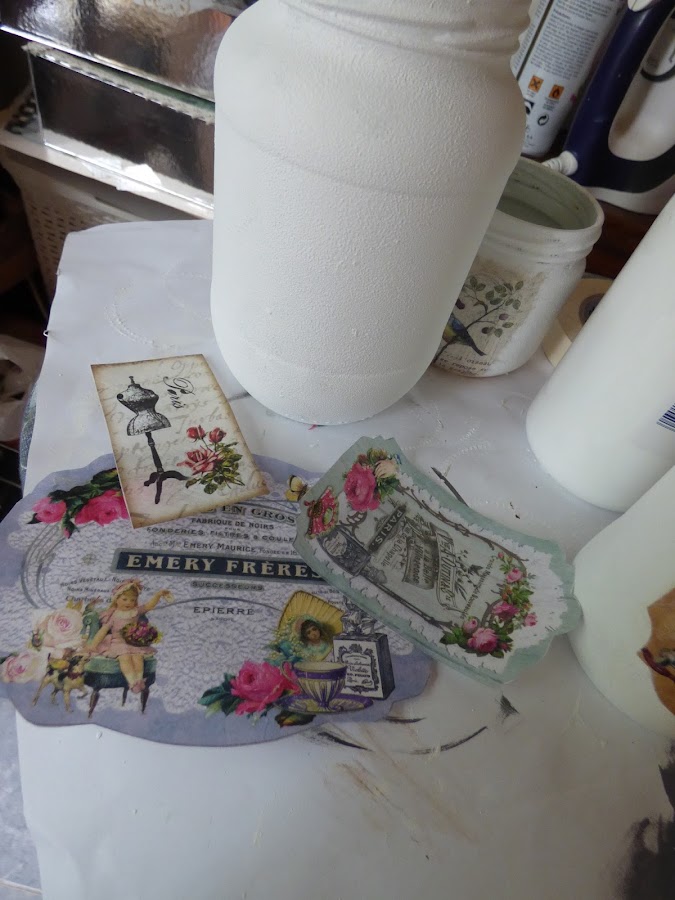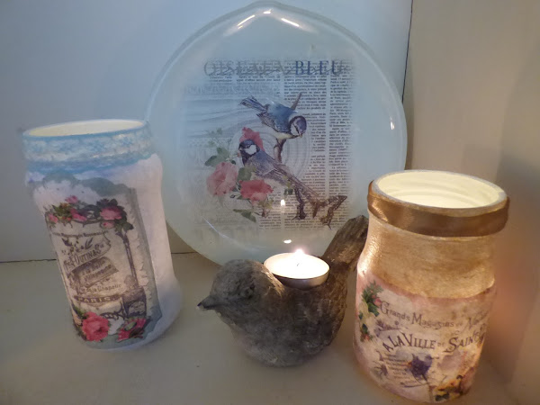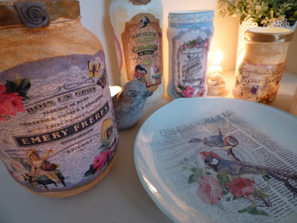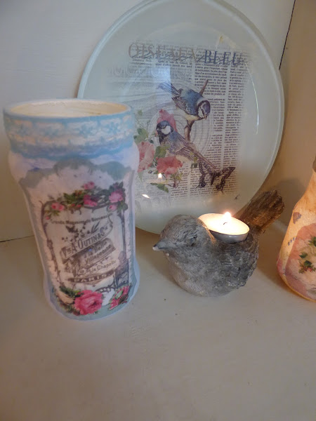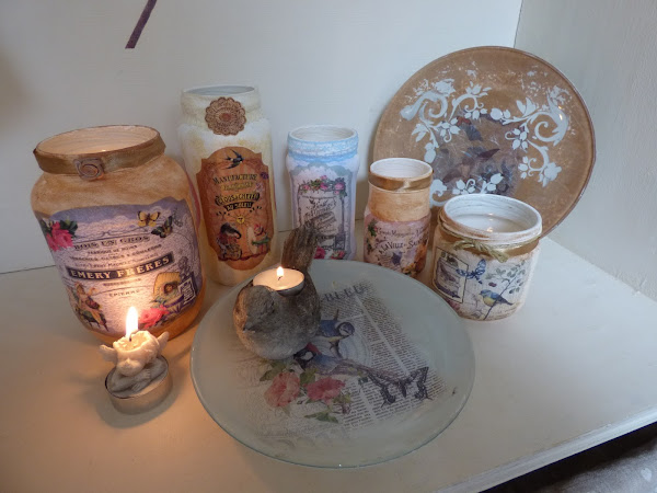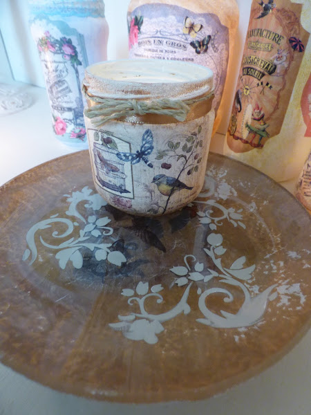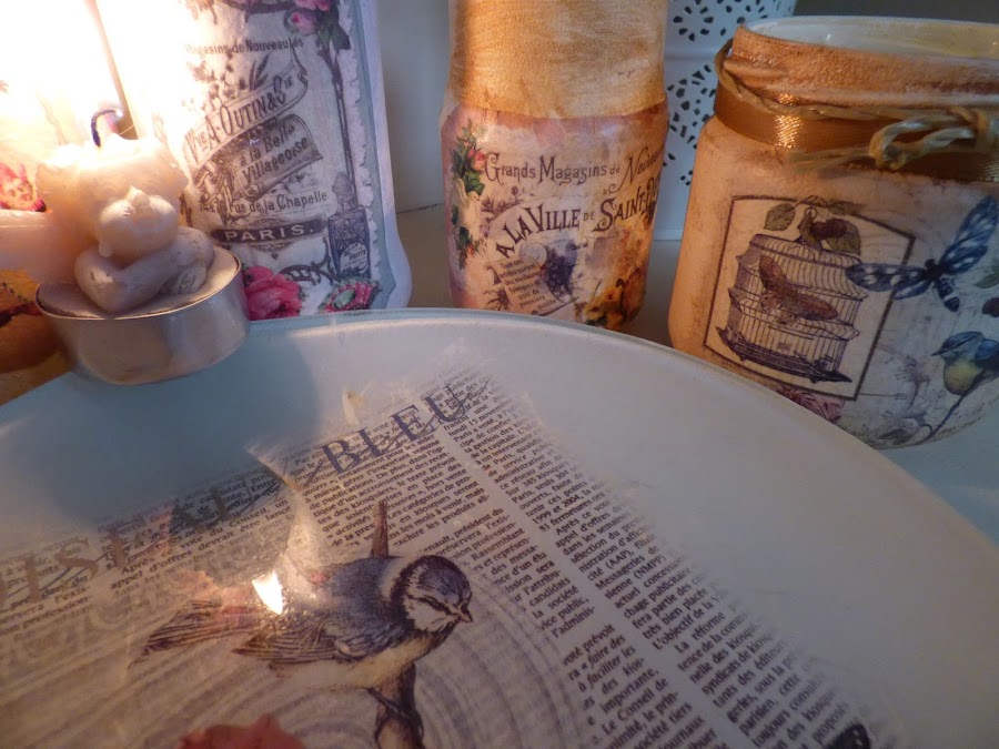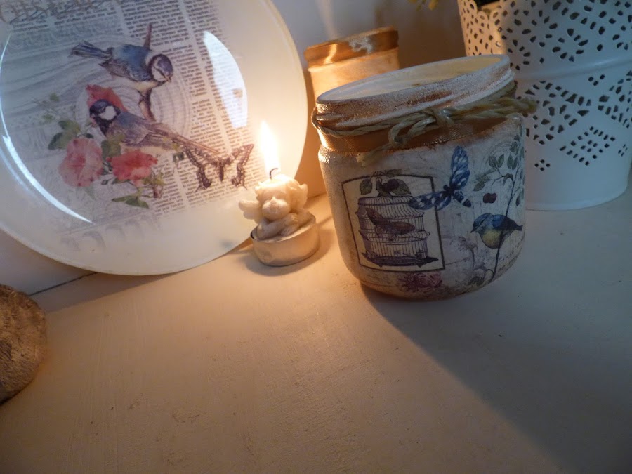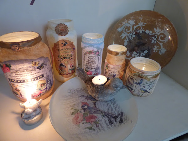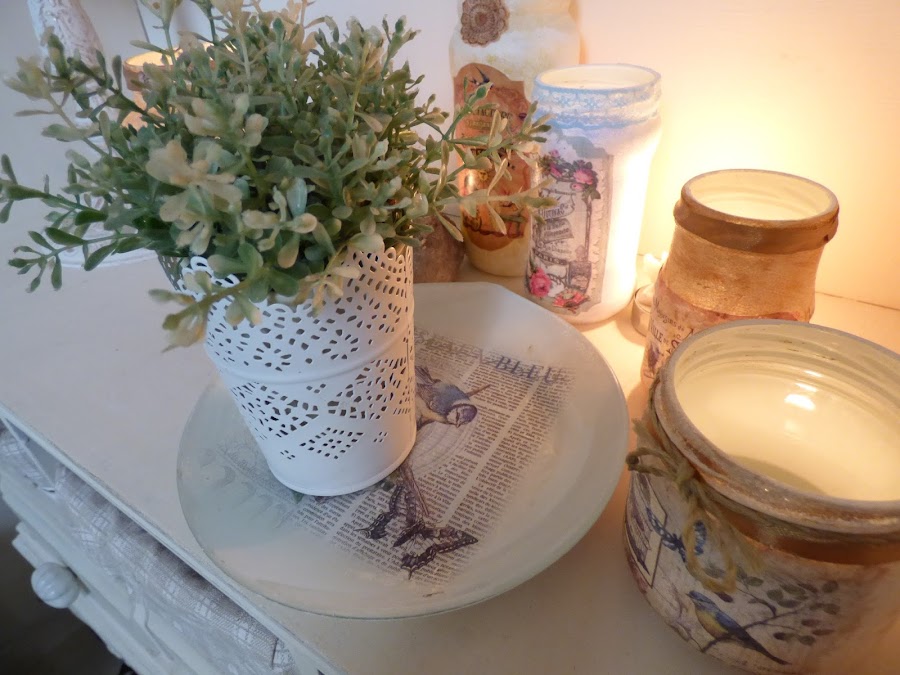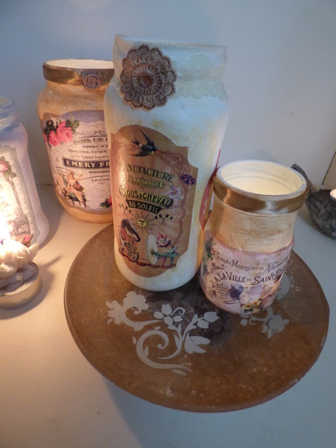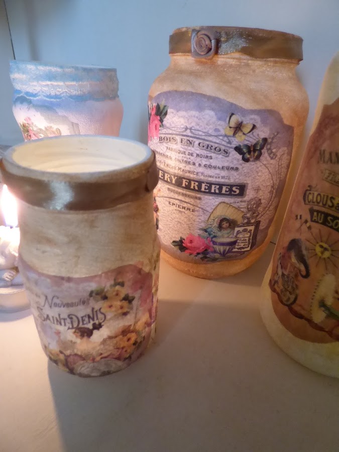En esto me he entretenido esta semana, en decorar unos cuantos tarros de cristal...uno de aceitunas, otro de alubias, otro de espárragos...en fin de todo lo que solemos comprar cada día....