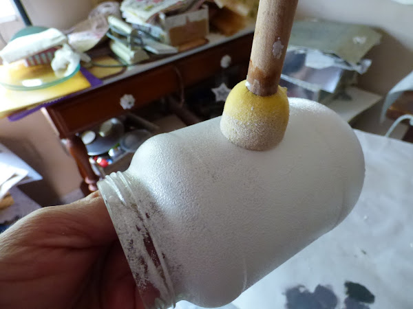 Una vez secos los papeles , fuí sombrenado los tarros con ceras al óleo. Utilicé un tostado para unos y un azul pálido para otro