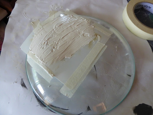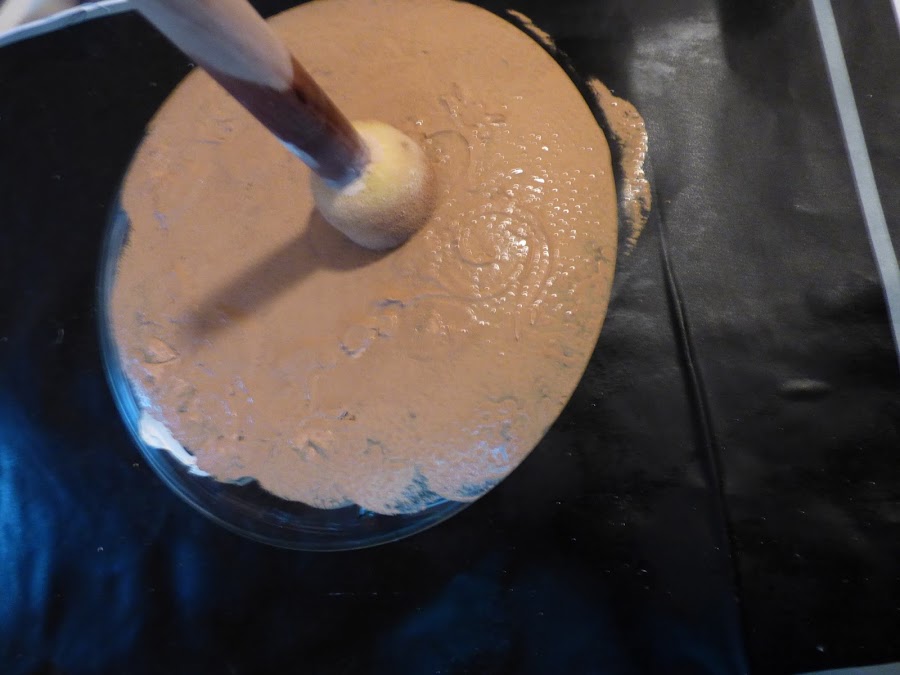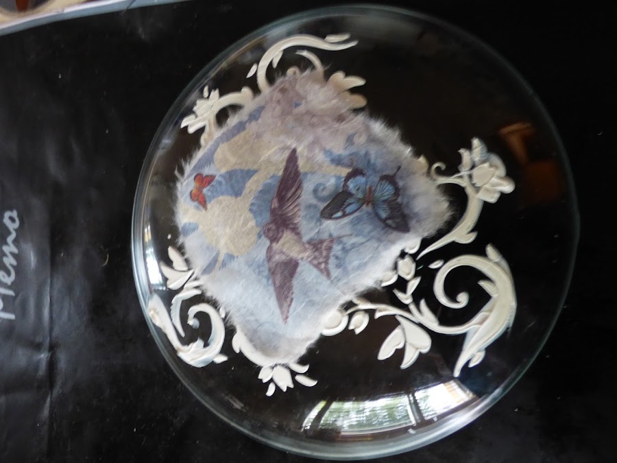El plato de color tostado lleva un relieve con stencil y pasta de relieve. Se trabaja por detrás como ya sabreis.