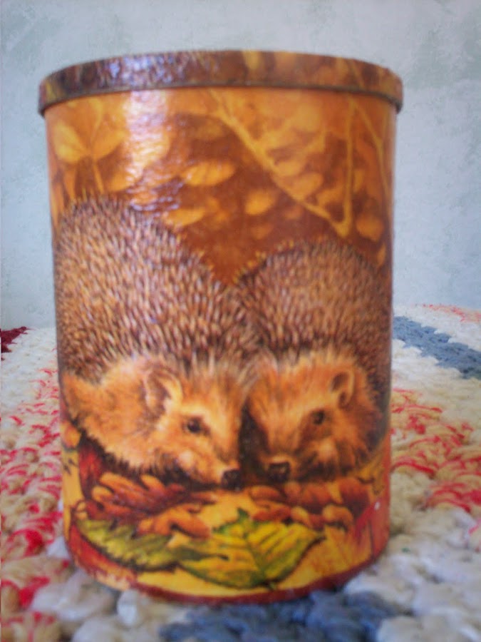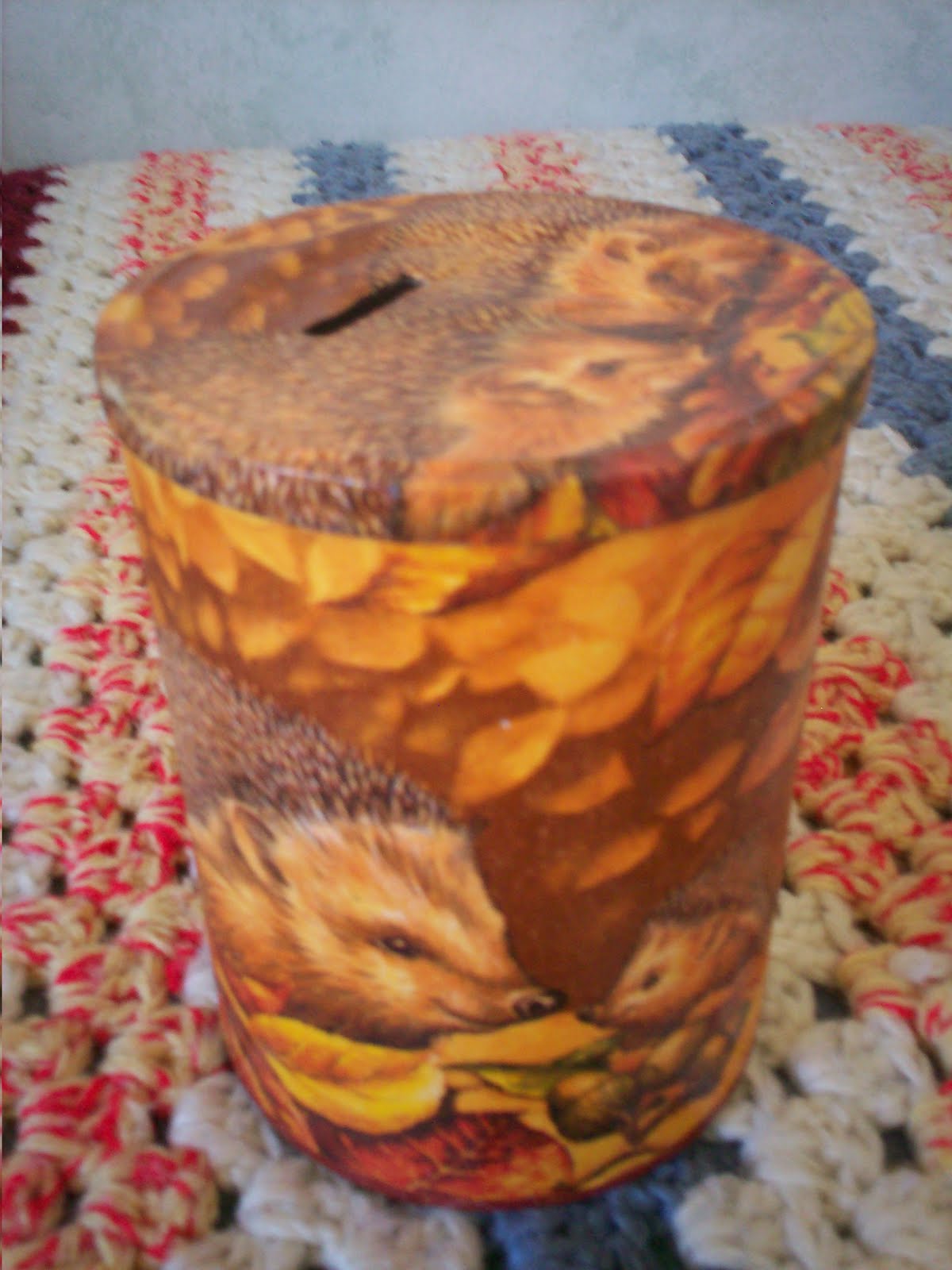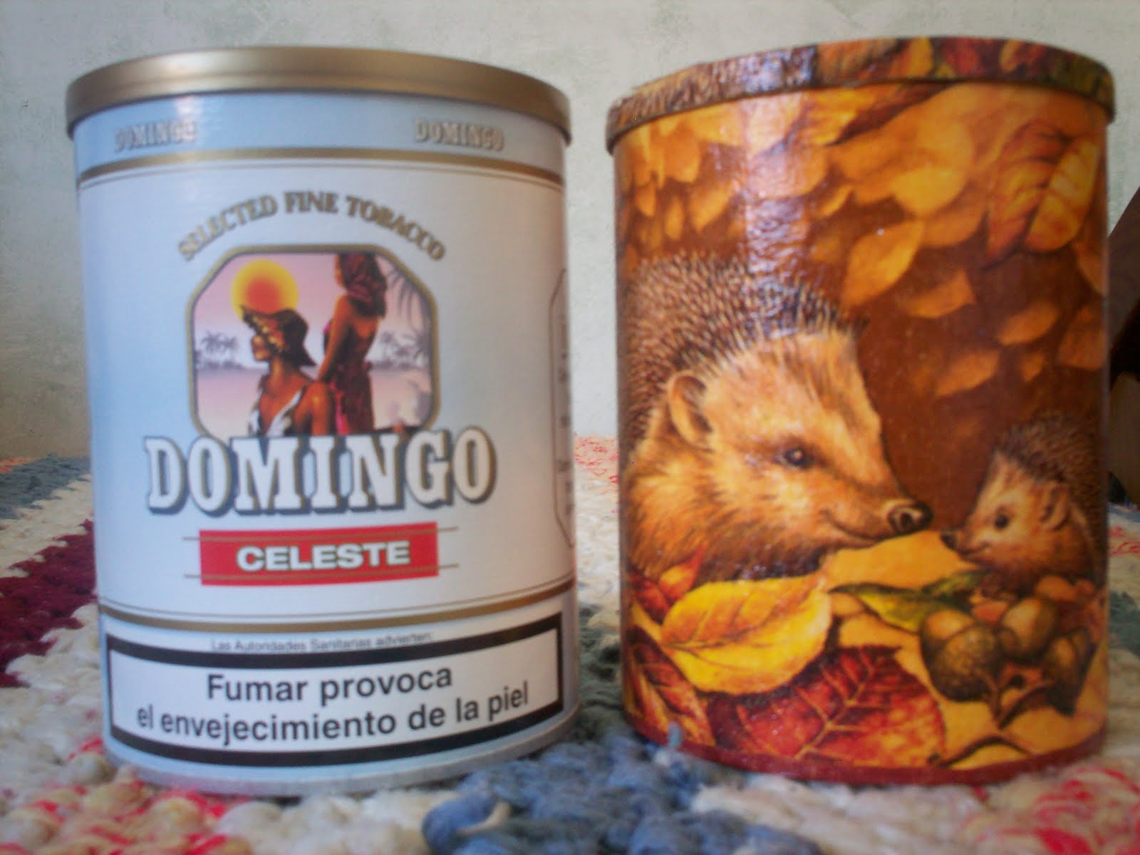 Espero que hayáis empezado bien el fin de semana. Aquí os dejo mi último reciclaje, ya que mi marido ha decidido dejar de fumar, pues le he hecho una huchita para que vaya metiendo el dinero del tabaco en ella y que mejor que reciclar el bote del tabaco. Aquí está, a que es chulo, esta servilleta ya la habéis visto en otro trabajo mío, en una maceta. Bueno los pasos de la hucha son muy sencillos, le di dos manos de imprimación para tapar las letras más que nada y como es blanca, pues no la pinté ya que he colocado toda la servilleta alrededor del bote y la tapa pues igual, finalmente le hice el agujerito para ir echando las moneditas. Espero que os guste y hasta otra amigas.
